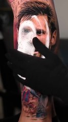 This tattoo artist attempted to show their creative skills. They made a tattoo of a famous football player in a hyper-realistic fashion on a person. The tattoo artist added impressive details to make the tattoo look real.